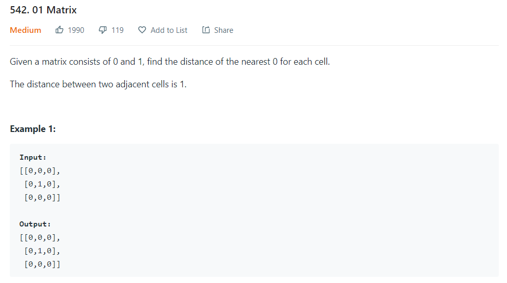 [LEETCODE] 542. 01 Matrix 사용 알고리즘 DP 사용 풀이 로직 각 원소가 이웃한 가장 가까운 0과의 거리를 구해아한다. 최소값을 구해야하므로 dp를 inf로 두고 진행한다. 왼쪽 위부터 돌면서 왼쪽과 위쪽을 비교해 최소값 찾기 오른쪽 아래부터 돌면서 오른쪽과 아래쪽을 비교해 최소값 찾기 코드 어려웠던 점 처음에 matrix[i][j] == 1인 경우마다 bfs를 이용해 풀었는데, 무한루프로 잘 돌아가지 않았습니다. 알고리즘 2021.01.09