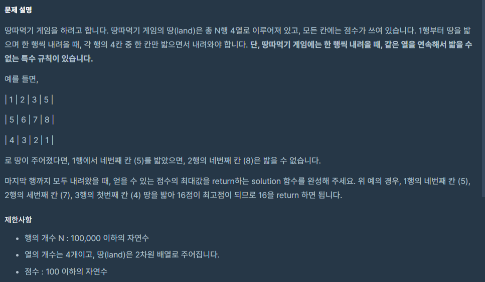 [programmers] 땅따먹기 로직 - 계속 더해가면서 최대값을 찾는다. 이때, 바로 아래에 있는 값은 사용하지 못한다. - 위 -> 아래 가려면 아래 값을 "val = 아래값" 으로 지정해두고나서 더하면서 max값을 찾아야한다. - 아래 -> 위 가면 그냥 최대값을 찾으면 됨. 이때, 바로 위의 값을 제외한 리스트의 max값을 찾는다. 코드 주의할 점 1. DP사용하기! 알고리즘 2020.10.23