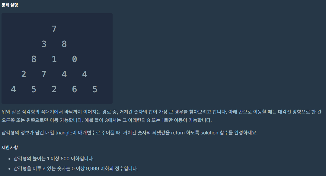 [programmers] 정수 삼각형 로직 1. 가쪽에서 더해지는 값은 계속 더해진다. 2. 왼쪽, 오른쪽에서 더해질 수 있는 값 중 최대값을 더해준다. 코드 알고리즘 2020.10.14